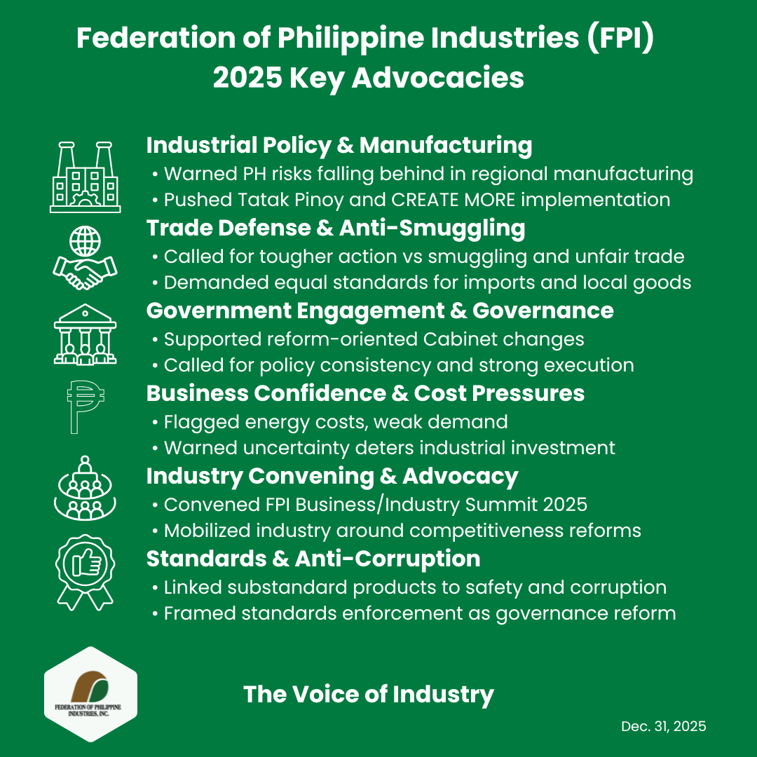 FPI, the Voice and Champion of the Philippine Industry, is an indispensable partner of the Philippine Government whose advice and counsel are sought to promote and develop globally-competitive industries.